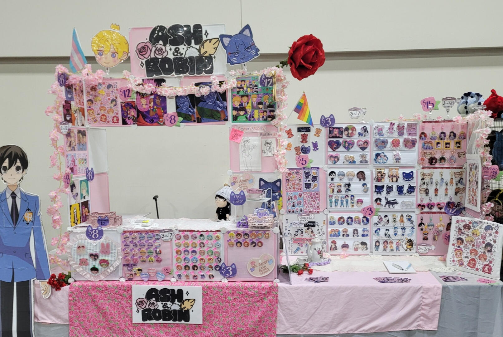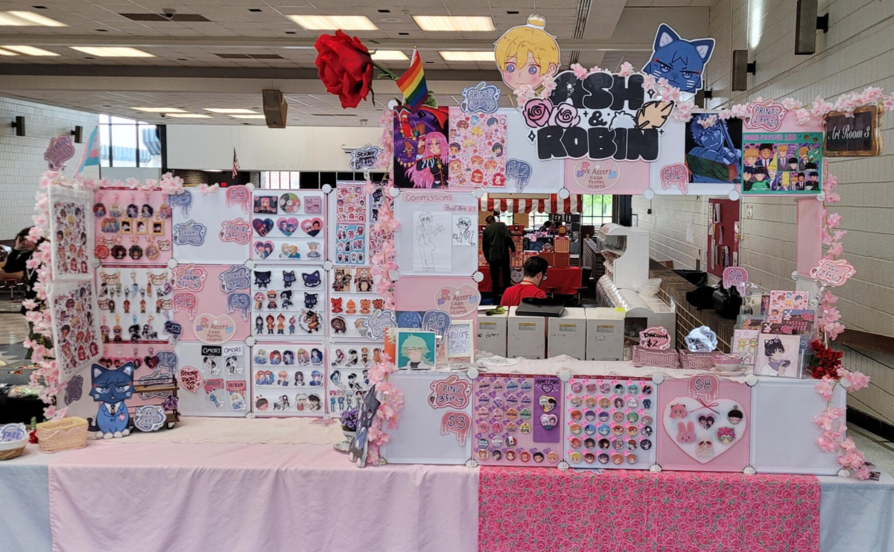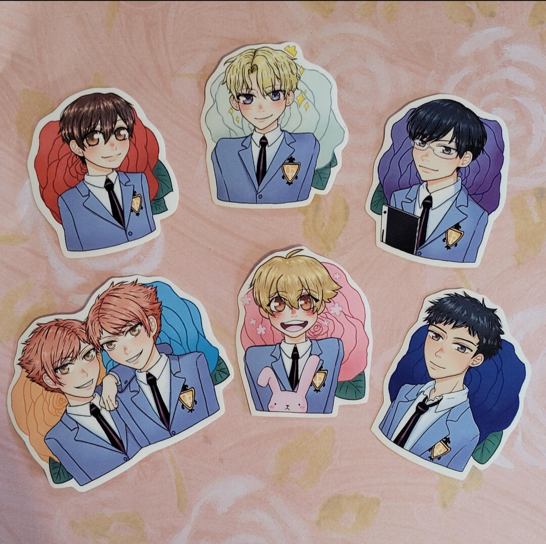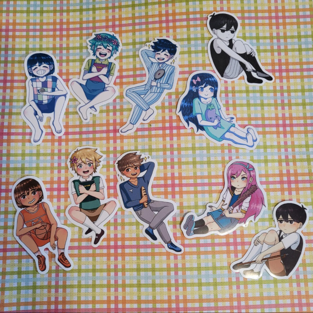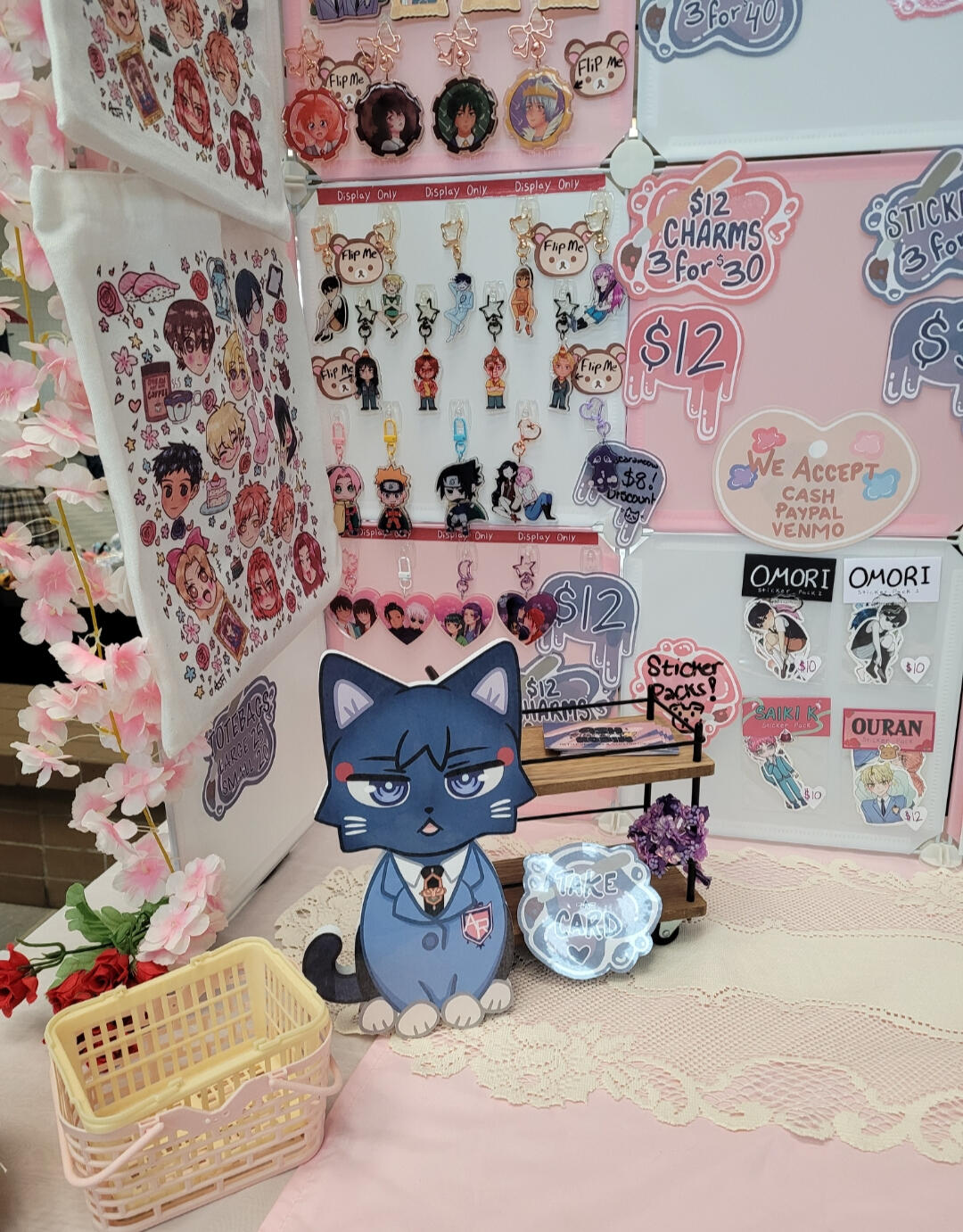 We sell stickers, charms, prints, pins, and tote bags.
